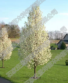 新布拉德福:干性好,樹(shù)形半開(kāi)張豐滿,小枝褐色,干皮灰褐色光滑;花白色,傘形總狀花序,量大,先花后葉,開(kāi)花一致,通體雪白;花期4月上、中旬,花期長(zhǎng)約15天;果實(shí)長(zhǎng)橢圓形,有褐色斑點(diǎn),結(jié)實(shí)量大,掛果期可達(dá)6個(gè)月;葉卵形,葉基平截,葉緣有細(xì)鈍鋸齒,秋季葉片紫紅,變色30~35天左右。