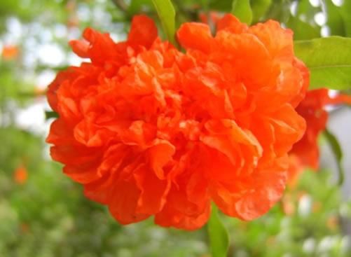 ⑷牡丹石榴:花冠大,狀如繡球牡丹,重瓣,花型多樣,花期長(zhǎng)達(dá)5個(gè)月。果實(shí)大,近球形,皮色黃中透紅,籽粒紅色,風(fēng)味佳,可溶性固形物17-19%。果實(shí)在9月下旬成熟。